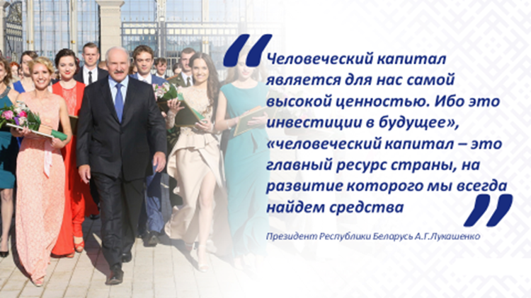 Глава государства А.Г.Лукашенко неоднократно подчеркивал, что "человеческий капитал является для нас самой высокой ценностью. Ибо это инвестиции в будущее", "человеческий капитал – это главный ресурс страны, на развитие которого мы всегда найдем средства".